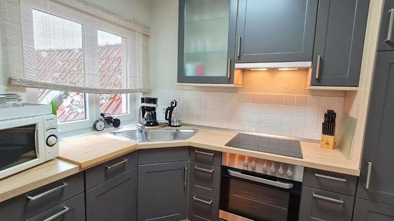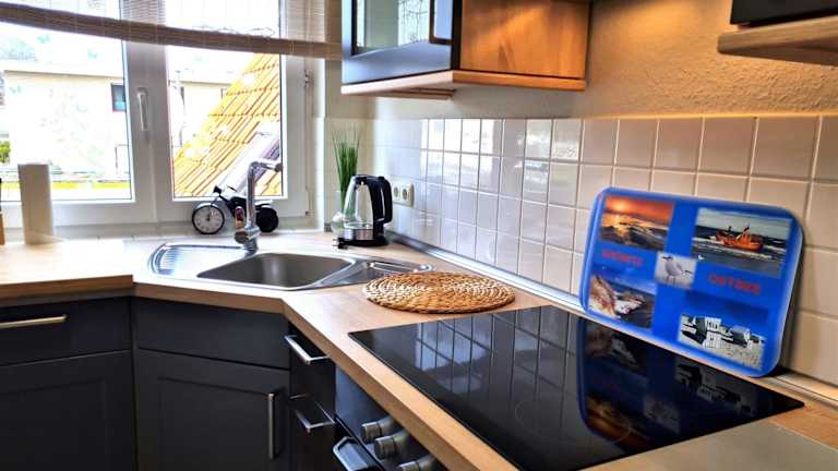 Die Ferienwohnung ist mit einer Küchenzeile ausgestattet, die einen Kühlschrank und Geschirrspüler beinhaltet. Es bestehen keine Angaben zu weiteren Verpflegungsmöglichkeiten vor Ort.