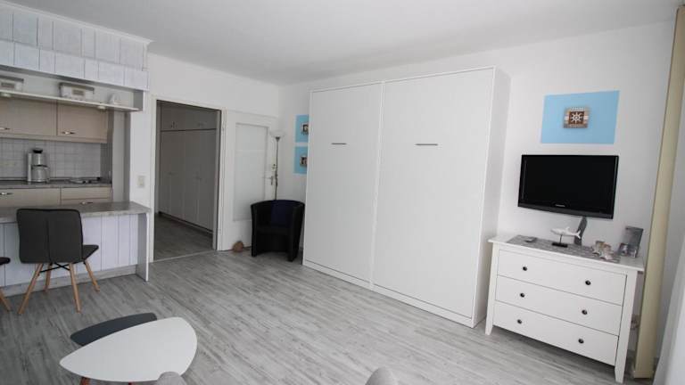 Die Ferienwohnung ist mit einer voll ausgestatteten Küche versehen, die einen Kühlschrank und Geschirrspüler beinhaltet, was die Zubereitung von eigenen Mahlzeiten möglich macht. Es sind keine spezifischen Verpflegungsmöglichkeiten erwähnt.
