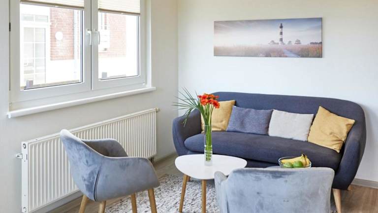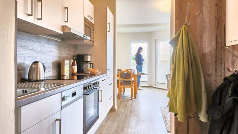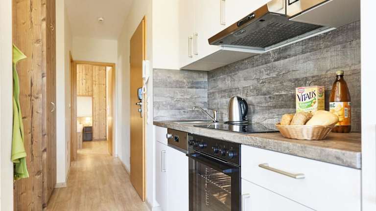 Die Ferienwohnung besteht aus einem Schlafzimmer, einem Wohnzimmer, einer voll ausgestatteten Küche mit Kühlschrank und Kaffeemaschine, sowie einem Badezimmer mit Dusche und kostenlosen Pflegeprodukten. Handtücher und Bettwäsche können gegen Aufpreis bereitgestellt werden.