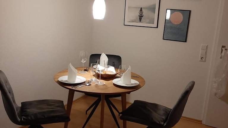 Die Ferienwohnung umfasst ein Schlafzimmer, ein Wohnzimmer mit Flachbild-TV und eine gut ausgestattete Küche mit Kühlschrank und Geschirrspüler. Ein Badezimmer mit Dusche ist ebenfalls vorhanden. Handtücher und Bettwäsche werden bereitgestellt.