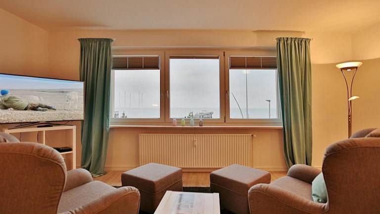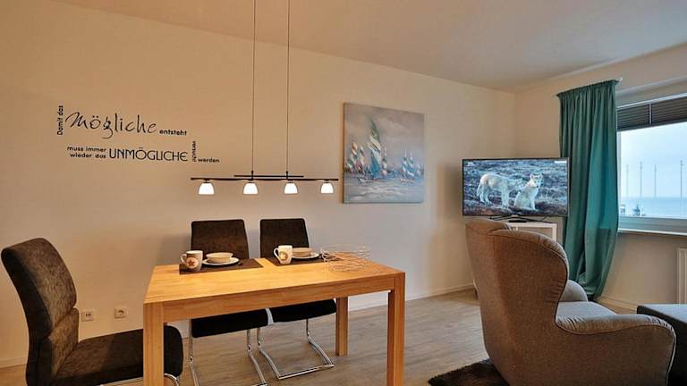 Die Unterkunft Haus Seebrücke Appartement 08 bietet Übernachtungsmöglichkeiten mit Meerblick. Die Ferienwohnung verfügt über ein Wohnzimmer sowie eine voll ausgestattete Küche, die mit einem Kühlschrank und einem Geschirrspüler ausgestattet ist. Ein Fernseher und ein Blu-ray-Player sind ebenfalls vorhanden. Bettwäsche und Handtücher können gegen Aufpreis ausgeliehen werden.