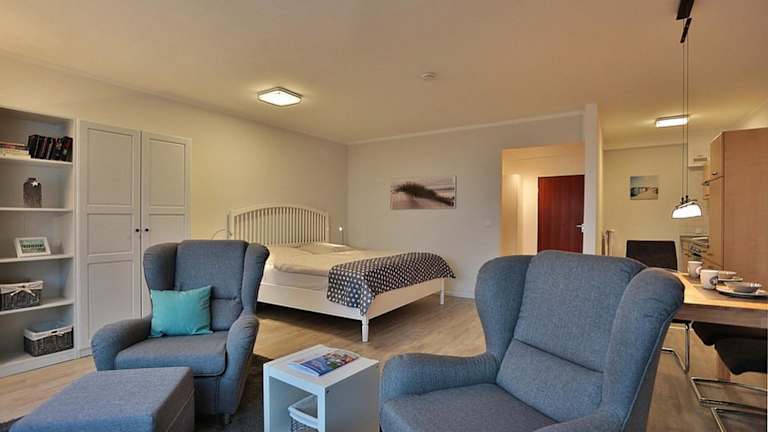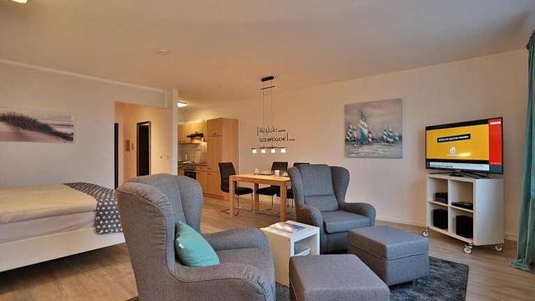 Die Ferienwohnung ist mit einem Wohnzimmer sowie einer komplett ausgestatteten Küche eingerichtet. Es gibt die Möglichkeit, Bettwäsche und Handtücher gegen einen Aufpreis auszuleihen.