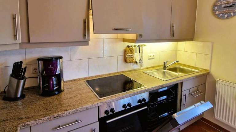 Das Ferienwohnung umfasst zwei Schlafzimmer, eine voll ausgestattete Küche mit Kühlschrank und Geschirrspüler sowie ein Badezimmer mit Dusche und Haartrockner. Ausserdem ist die Unterkunft mit einem TV, einem Blu-ray-Player und einem CD-Player ausgestattet.