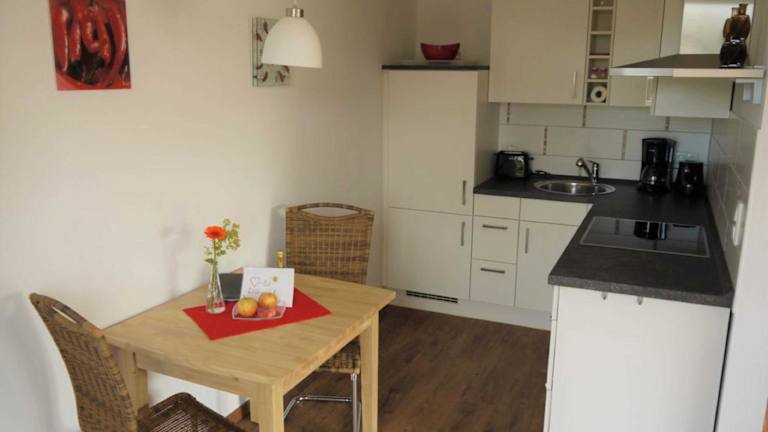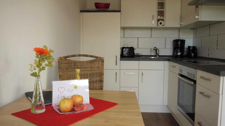 In jeder Ferienwohnung ist eine voll ausgestattete Küchenzeile vorhanden, die es den Gästen ermöglicht, sich selbst zu verpflegen. Zudem sind Tisch und Stühle für ein geselliges Essen vorhanden. Für den Genuss von kleinen Snacks und Getränken sind Kaffeemaschine und Wasserkocher ebenfalls vorhanden.