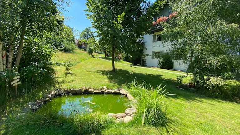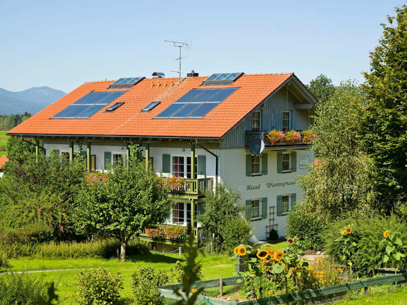 Die Unterkunft Haus Wiesengrund befindet sich in Frauenau und bietet einen schönen Blick auf die umliegenden Berge sowie einen einladenden Garten mit einer Terrasse.