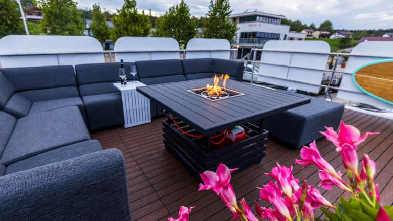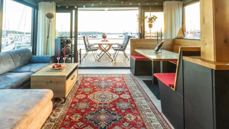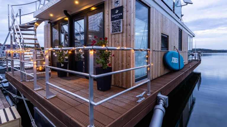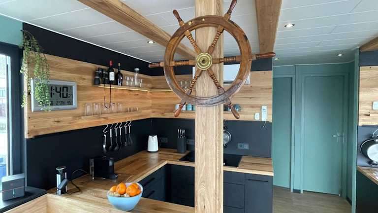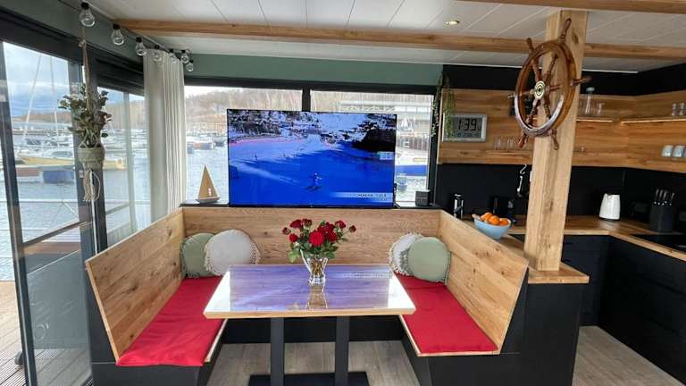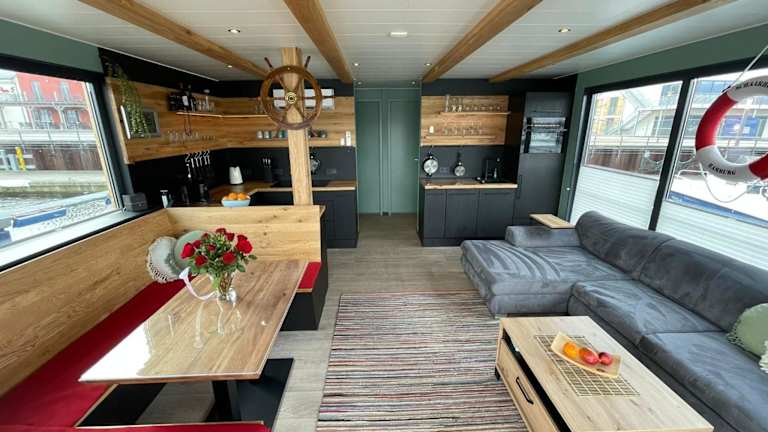 Das Hausboot besteht aus zwei Schlafzimmern und einem Wohnzimmer. Die Ausstattung umfasst ein Badezimmer mit Dusche, eine Kaffeemaschine, einen Kühlschrank sowie einen Flachbild-TV mit Satellitenkanälen und einen Blu-ray-Player. Eine Terrasse mit Grillmöglichkeiten sowie Gartenmöbel sind ebenfalls vorhanden.