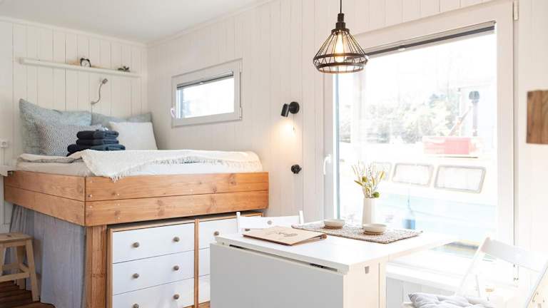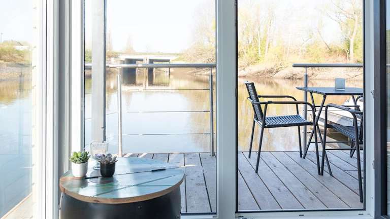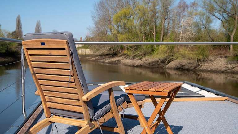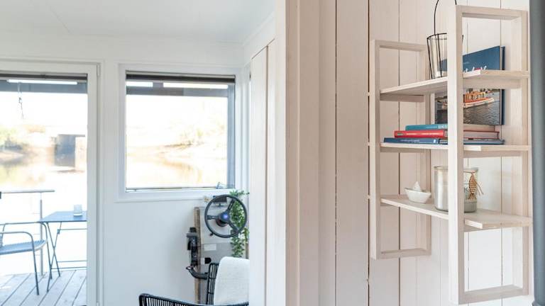 Das Boot verfügt über ein Schlafzimmer, ein Wohnzimmer und eine voll ausgestattete Küchenzeile mit Kühlschrank und Wasserkocher. Es beinhaltet ein Badezimmer mit Dusche und bietet eine herrliche Aussicht auf den Fluss.