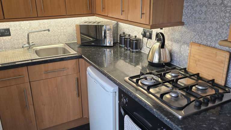 Die Ferienwohnung verfügt über eine voll ausgestattete Küche mit einem Kühlschrank und einer Kaffeemaschine, Tischgeschirr und Utensilien sind ebenfalls vorhanden.