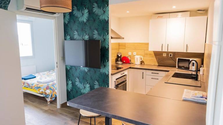 Die Ferienwohnung umfasst ein Schlafzimmer und ist mit Klimaanlage, einem Flachbild-TV, einem Essbereich sowie einer Küche mit Kühlschrank und Mikrowelle ausgestattet. Handtücher und Bettwäsche werden bereitgestellt.