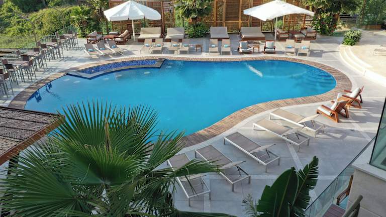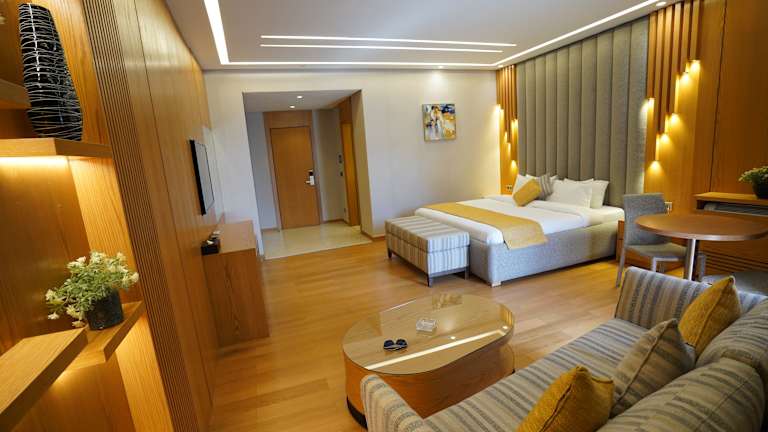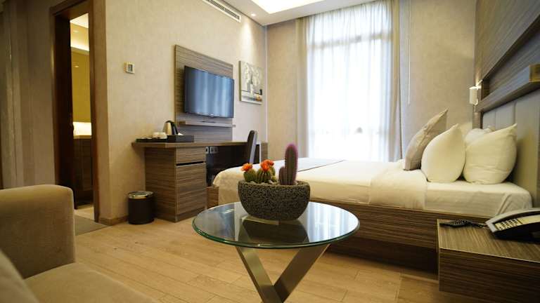 Die Zimmer sind mit Klimaanlage, einem Flachbild-TV mit Satellitenkanälen, einem Kühlschrank, einem Wasserkocher, einer Dusche, einem Haartrockner und einem Kleiderschrank ausgestattet. Alle Zimmer bieten einen Safe, einige verfügen über einen Balkon oder einen Blick auf den Pool.