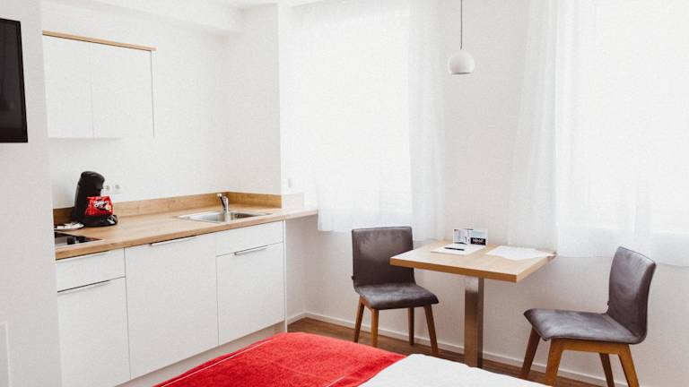 Die Wohneinheiten im HEIMAT | Hotel & Boarding House sind mit Parkettböden ausgestattet und bieten eine voll eingerichtete Küchenzeile mit Kühlschrank, Herdplatte und Kaffeemaschine. Ein Flachbild-TV ist ebenfalls vorhanden, ebenso wie ein eigenes Badezimmer mit Dusche und Haartrockner.