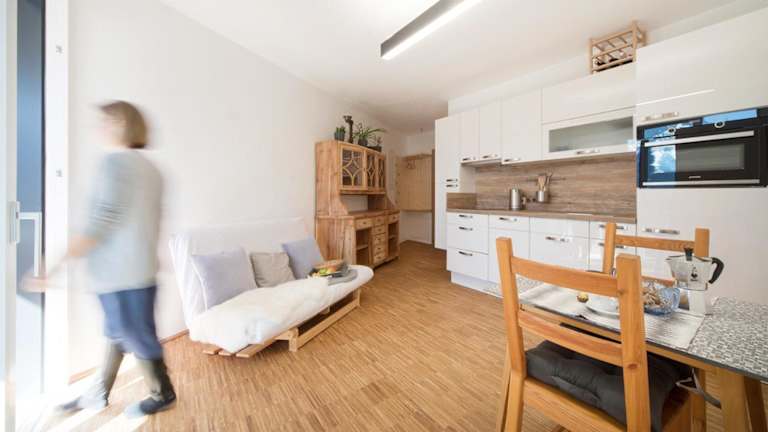Die Ferienwohnung umfasst ein Schlafzimmer, ein Wohnzimmer sowie eine voll ausgestattete Küche mit Kühlschrank und Kaffeemaschine. Ein Badezimmer mit Dusche und Haartrockner ist ebenfalls vorhanden. Handtücher und Bettwäsche werden bereitgestellt.