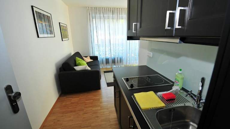 Die Studios sind schallisoliert und bieten eine gemütliche Atmosphäre mit einer Küchenzeile und einem eigenen Badezimmer, in dem ein Haartrockner bereitliegt.