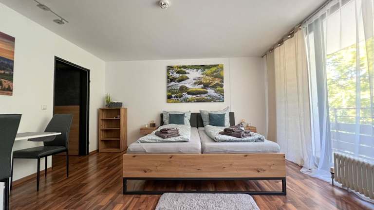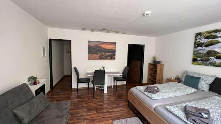 Helle FeWo am Waldrand bietet Übernachtungsmöglichkeiten mit kostenlosem Wifi sowie einem Restaurant. Die Ferienwohnung verfügt über einen Balkon und gehört zu einem Komplex, der sowohl einen Innenpool als auch eine Sauna umfasst.
