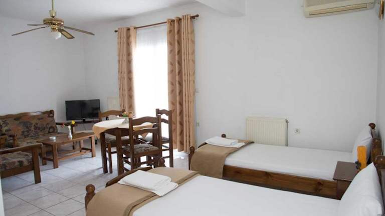 Die Zimmer im Hotel Hellenic Sun sind komfortabel und gut ausgestattet. Jedes Zimmer verfügt über ein eigenes Bad mit einer Badewanne oder einer Dusche. Zur Ausstattung gehören auch Klimaanlage, Flachbild-TV und Kühlschrank. Die Küche ist mit einem Backofen, einem Kochfeld, einem Toaster und einem Wasserkocher ausgestattet.