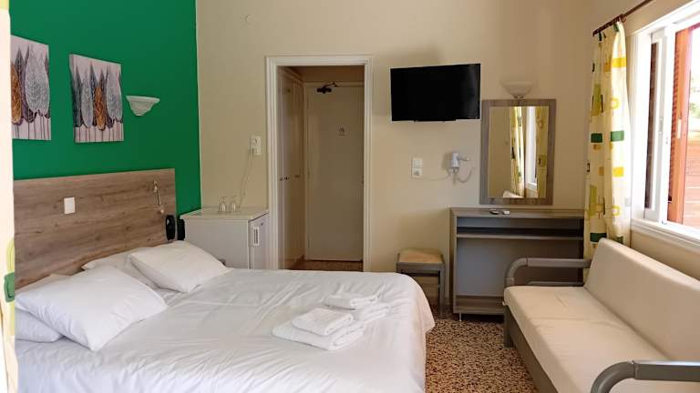 Die Zimmer in der Unterkunft Hermes sind gut ausgestattet mit Klimaanlage, Kleiderschrank, Balkon mit Gartenblick, eigenem Badezimmer, Flachbild-TV und Kühlschrank. Die Gäste finden zudem Bettwäsche und Handtücher vor. Die Unterkunft bietet Schallisolierung und tägliche Reinigung der Zimmer.
