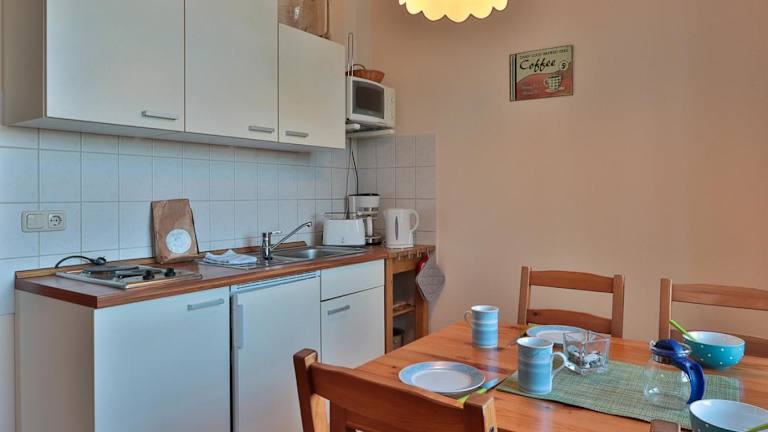 Die Ferienwohnung verfügt über einen Satelliten-TV und eine Küchenzeile, die mit einem Kühlschrank, einer Mikrowelle, einem Toaster, einer Kaffeemaschine und einem Wasserkocher ausgestattet ist.