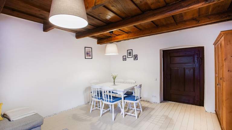 Das Ferienhaus umfasst ein Schlafzimmer, ein Wohnzimmer, eine voll ausgestattete Küche mit Kühlschrank und Kaffeemaschine sowie ein Badezimmer mit Dusche und Haartrockner. Handtücher und Bettwäsche werden zur Verfügung gestellt.