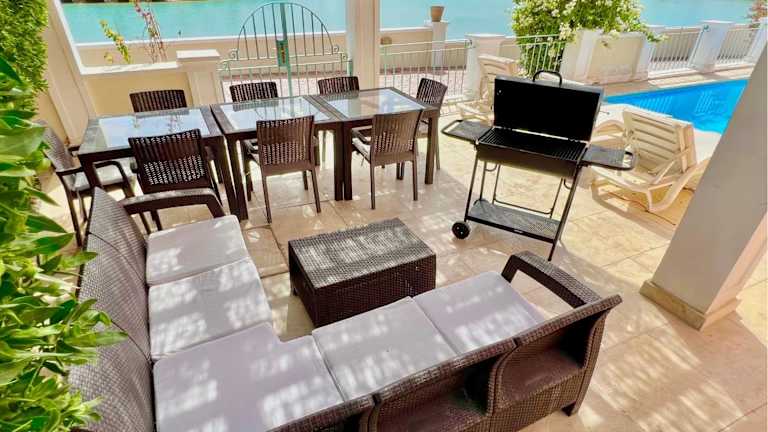Die Villa verfügt über 5 Schlafzimmer, ein Wohnzimmer sowie eine voll ausgestattete Küche mit Kühlschrank und Kaffeemaschine. Es stehen 5 Badezimmer mit Dusche und Haartrockner zur Verfügung. Handtücher und Bettwäsche sind bereitgestellt.