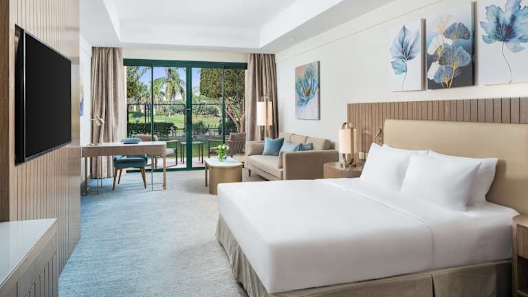 Im Hilton Hotel Pyramids Golf Resort gibt es 229 Hotelzimmer mit Klimaanlage. Ein Café, eine Bar, ein Restaurant, ein Seminarraum sowie ein Gepäckraum sind in der Unterkunft vorhanden. Ein Fahrstuhl zählt selbstverständlich auch zur Anlage. Das Hotel verfügt über einen Friseur-/Schönheitssalon und einen Geschenkeladen. Zum Dienstleistungspaket des Hotels zählt Weckdienst, Chemische Reinigung, Bügelservice sowie Wäscheservice. Urlaubern, die mit einem Auto anreisen, steht ein kostenloser Privatparkplatz zur Verfügung. Das Hotel organisiert den Gästen gerne einen Shuttle-Service ins Stadtzentrum.