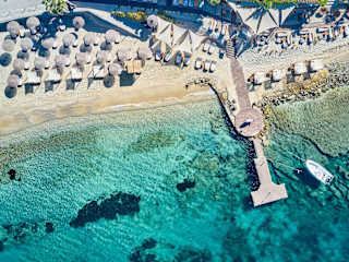 Das Hippie Chic Hotel befindet sich direkt am Strand von Agios Ioannis auf Mykonos. Das kosmopolitische Zentrum von Mykonos-Stadt ist etwa 4 km entfernt. Der Hafen sowie der Flughafen der Insel befinden sich im Umkreis von 4,5 km. Eine Parkiermöglichkeit steht den Gästen kostenlos zur Verfügung.