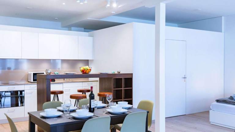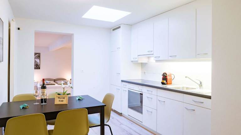Jede Wohnung verfügt über eine voll ausgestattete Küche mit Kühlschrank, Geschirrspüler, Ofen, Mikrowelle, Toaster, Kaffeemaschine und Wasserkocher, was die Zubereitung von eigenen Mahlzeiten ermöglicht.