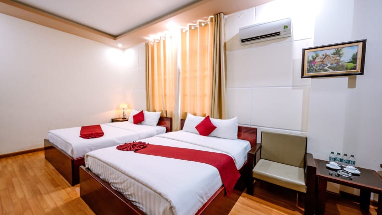 Die Zimmer im Hoang Duc Hotel sind modern und komfortabel eingerichtet. Jedes Zimmer verfügt über Annehmlichkeiten wie Klimaanlage, Flachbild-TV mit Kabelkanälen, einen eigenen Safe und einen kleinen Kühlschrank. Das eigene Bad ist mit einer Dusche, Pflegeprodukten, einem Spray-Bidet und einem Haartrockner ausgestattet. Kostenloses WLAN ist in allen Zimmern verfügbar, so dass die Gäste jederzeit mit Familie und Freunden in Verbindung bleiben können.
