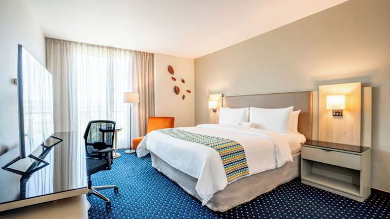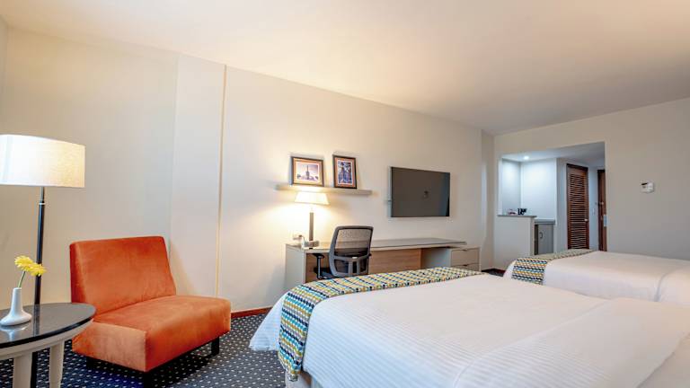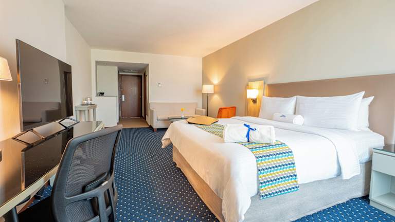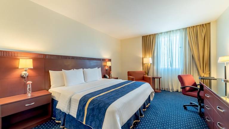 Die Zimmer verfügen über eine individuell steuerbare Klimaanlage, ein Doppelbett, ein Queensize-Bett oder ein Kingsize-Bett, sowie eine Minibar und einen Schreibtisch. Eine Tee-/Kaffeemaschine steht ebenfalls zur Verfügung, genauso wie ein Bügelset für zusätzlichen Komfort. Zudem sind ein Telefon mit Direktwahl, ein TV-Gerät mit Satelliten-/Kabelempfang, ein Radio und Wifi verfügbar. Das Badezimmer ist mit Dusche und Badewanne ausgestattet und bietet einen Haartrockner sowie Kosmetikartikel. Rollstuhlgerechte Zimmer und Familienzimmer sind ebenfalls buchbar.