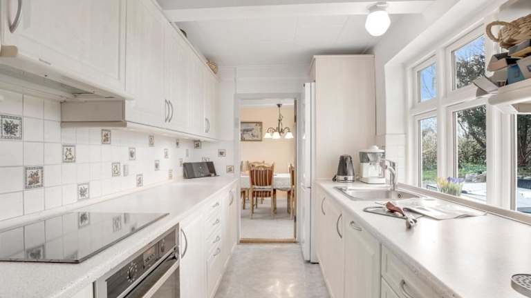 Die gut ausgestattete Küche beinhaltet einen Kühlschrank, Geschirrspüler und Ofen, jedoch sind keine Verpflegungsmöglichkeiten oder gastronomische Angebote erwähnt.