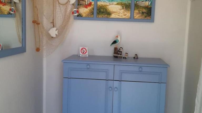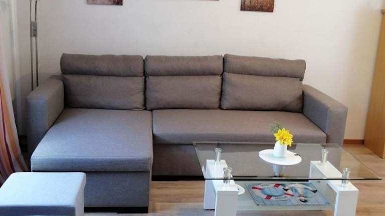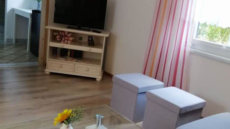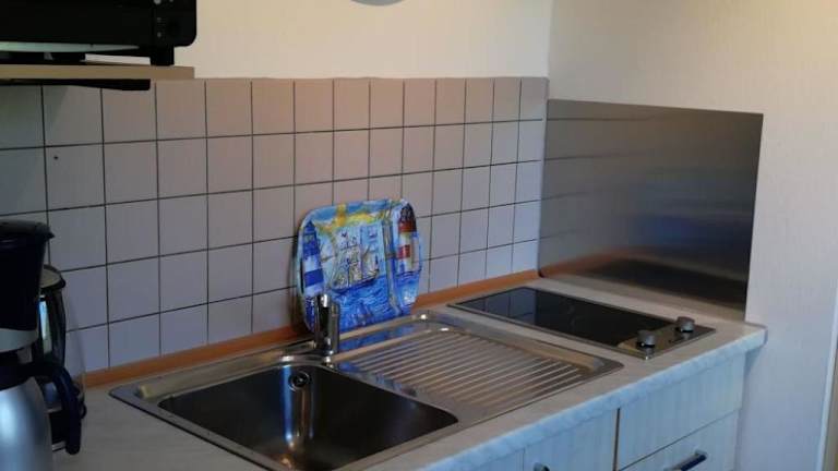 Das Ferienhaus ist ausgestattet mit einem TV sowie einer Küchenzeile, die mit einem Kühlschrank, einer Herdplatte, einer Kaffeemaschine und einem Wasserkocher versehen ist.