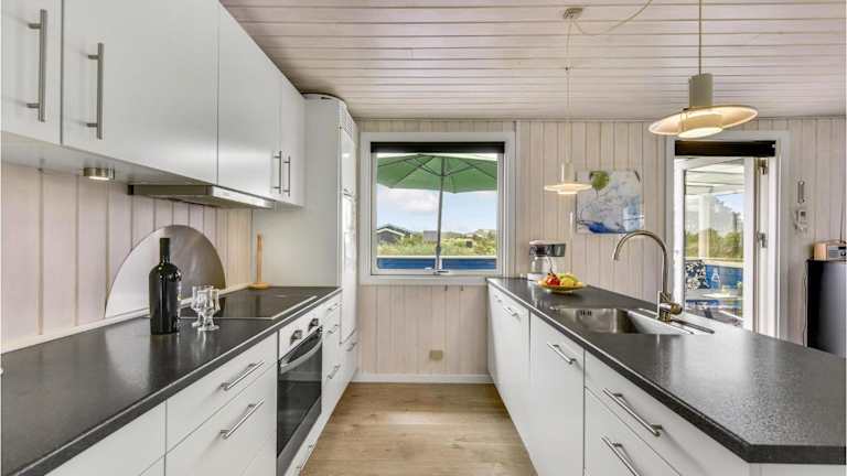 Das Ferienhaus umfasst 2 Schlafzimmer und ein mit allen Annehmlichkeiten versehenes Wohnzimmer. Die Küche ist ausgestattet mit modernen Geräten, darunter ein Kühlschrank und ein Geschirrspüler.