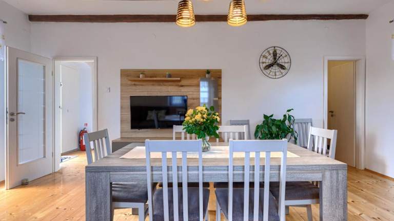 Das Ferienhaus besteht aus drei Schlafzimmern, einem gemütlichen Wohnzimmer sowie einer voll ausgestatteten Küche inklusive Kühlschrank und Kaffeemaschine. Zwei Badezimmer sind mit einer Dusche und einer Badewanne ausgestattet. Ein Fernseher mit Satellitenkanälen sorgt für Unterhaltung. Ein Babybett kann kostenlos zur Verfügung gestellt werden.