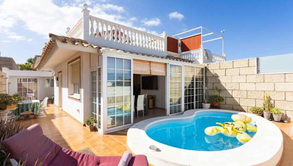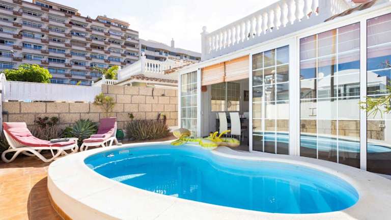 Holiday home in Palm-Mar - Insel Teneriffa 4654 zeichnet sich durch einen eigenen Pool aus und bietet eine moderne Villa mit Klimaanlage. Die Unterkunft bietet eine Terrasse und stellt kostenloses WLAN in der gesamten Anlage zur Verfügung. Eine Überweisung des gesamten Buchungsbetrags vor der Anreise ist erforderlich, und es wird darauf hingewiesen, dass keine Feiern gestattet sind und das Mindestalter für den Check-in bei 18 Jahren liegt.