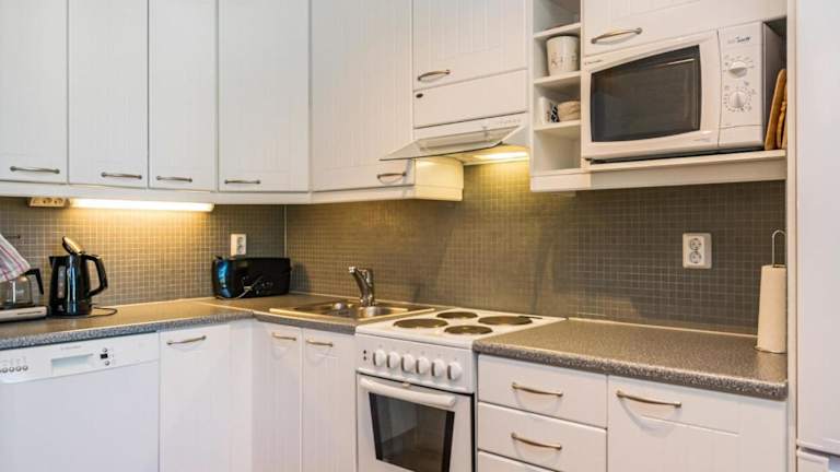 Das Ferienhaus ist ausgestattet mit einem TV und bietet eine gemütliche Atmosphäre für den Aufenthalt. Es gibt auch eine Küchenzeile mit Kühlschrank und Geschirrspüler.
