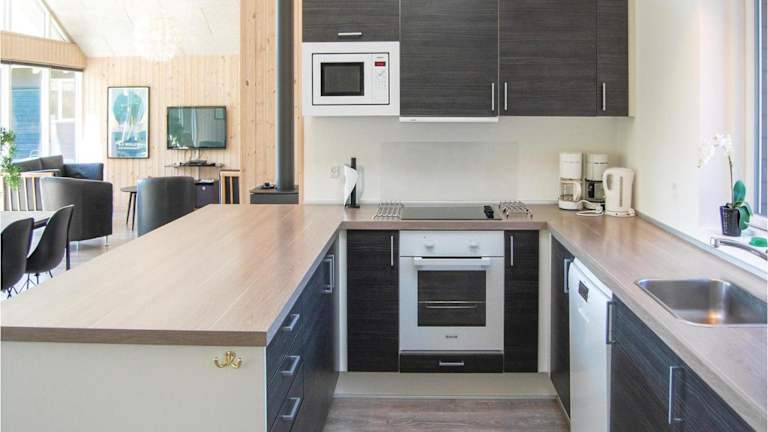 Die Küche ist eingerichtet mit einem Kühlschrank, Geschirrspüler, Mikrowelle und Kaffeemaschine, sodass die Gäste selbständig ihre Mahlzeiten zubereiten können.