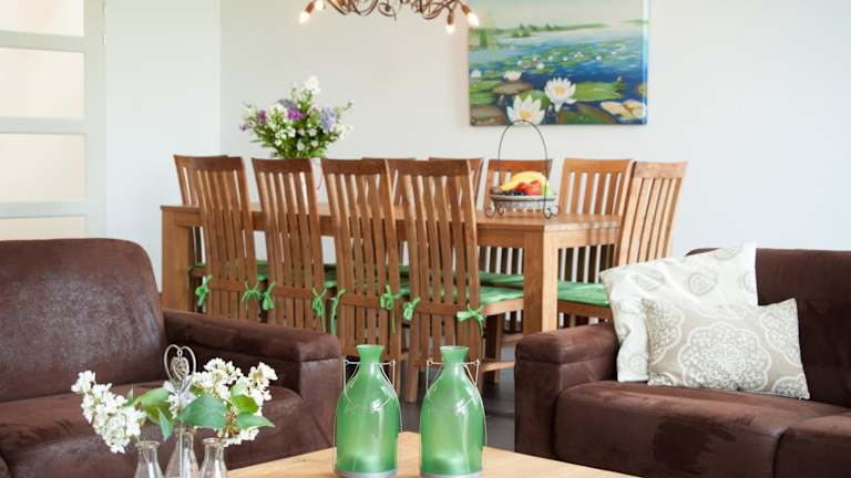 Die Ferienhäuser sind mit einer voll ausgestatteten Küche ausgestattet, in der die eigenen Mahlzeiten zubereitet werden können. Auf Wunsch und gegen Aufpreis kann der Kühlschrank mit Zutaten für das Frühstück gefüllt werden. Mehrere Restaurants sind in nur 7 Minuten mit dem Auto erreichbar.