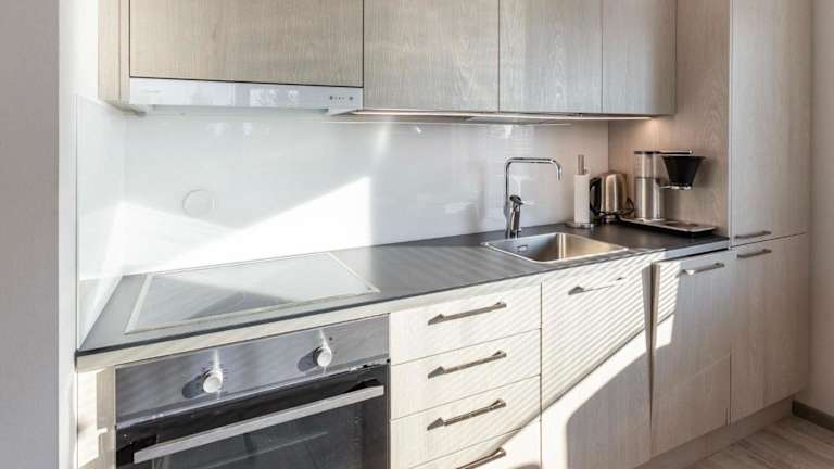 Die Unterkunft verfügt über eine Küchenzeile, die mit einem Kühlschrank und einem Geschirrspüler ausgestattet ist. Dies eignet sich gut für Selbstversorger während des Aufenthalts. Die Bereitstellung von Bettwäsche, Handtüchern und Wäsche erfolgt nach den Richtlinien der örtlichen Behörden.