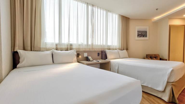 Die Zimmer verfügen über eine Klimaanlage, ein Doppelbett, einen Safe, eine Minibar, einen Fernseher, eine Tee-/Kaffeemaschine sowie ein eigenes Badezimmer mit Dusche und Badewanne. Auch rollstuhlgerechte Zimmer sind verfügbar. Zu den Annehmlichkeiten gehören ein Wecker, ein Radio, ein DVD-Player und kostenfreies WiFi.