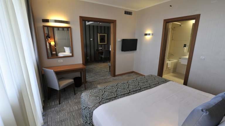 Die Zimmer sind mit einer Klimaanlage sowie individuell steuerbarer Heizung ausgestattet und bieten einen Stadtblick von Balkon oder Terrasse. Zur Ausstattung gehören ein Doppelbett, ein Queensize-Bett oder ein Kingsize-Bett, Zustellbetten auf Anfrage, ein Safe, eine Minibar, Kühlschrank, Tee-/Kaffeemaschine sowie ein Bügelset. Die Zimmer sind mit einem Telefon, einem TV-Gerät mit Satelliten-/Kabelempfang und kostenfreiem Wifi ausgestattet. Die Badezimmer verfügen über eine Dusche und eine Badewanne sowie über einen Haartrockner. Es sind auch rollstuhlgerechte Zimmer verfügbar.