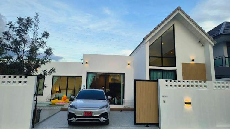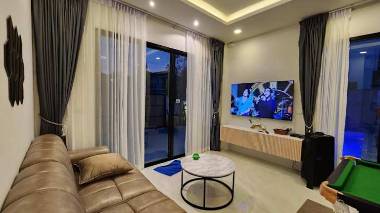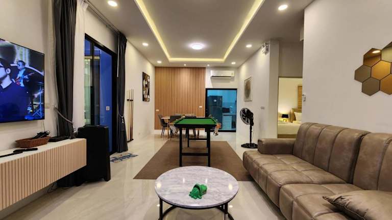 Die Unterkunft Holiday Pool Villa Bangsean Chonburi besteht aus 3 Schlafzimmern und bietet Platz für bis zu 10 Personen. Sie verfügt über einen eigenen Pool, einen Garten sowie kostenfreie Parkiermöglichkeiten. Die Villa ist klimatisiert und bietet eine modern eingerichtete Umgebung mit einem Wohnzimmer und einer voll ausgestatteten Küche.