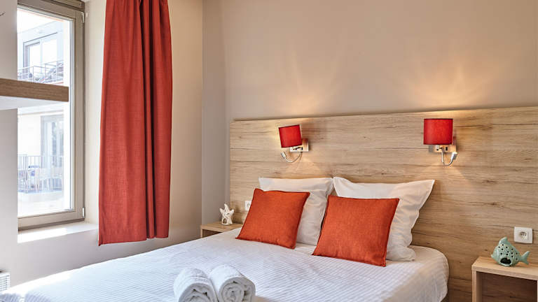 Es stehen verschiedene Appartement-Typen zur Verfügung: - 1-Raum-Appartement (ca. 23 m²): kombiniertes Wohn-/Schlafzimmer mit Schlafsofa, Etagenbett, individuell regelbare Klimaanlage, voll ausgestattete Küche (Kühlschrank, Backofen, Kochplatte, Mikrowelle, Geschirrspüler), Badezimmer mit Dusche, WC, Föhn und entweder Balkon oder Terrasse mit Sitzgelegenheit. - 2-Raum-Appartement (ca. 29 m²): Wohnzimmer, optisch abgetrenntes Kinderzimmer, Schlafzimmer mit King Size Bett, Etagenbett, individuell regelbare Klimaanlage, parquetierte Böden, Küche und Badezimmer mit Badewanne oder Dusche, WC, Föhn, ebenfalls mit Balkon oder Terrasse.