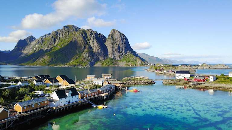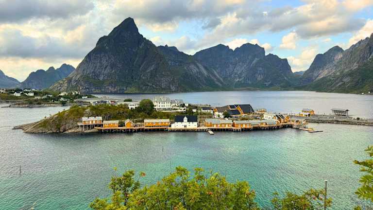 Die Insel Sakrisøy befindet sich im malerischen Reine Fjord und ist bekannt für ihre ockerfarbenen Hütten. In der Umgebung finden sich mehrereRestaurants, Geschäfte und der Startpunkt der Reinebringen-Wanderung nur eine kurze Autofahrt entfernt. Die Bushaltestelle ist in der Nähe des Eingangs zur Insel (Olenilsøya). Der Flughafen Leknes liegt etwa 50 Kilometer entfernt, während der Fähranleger nach Bodø nur etwa 10 Kilometer entfernt ist.