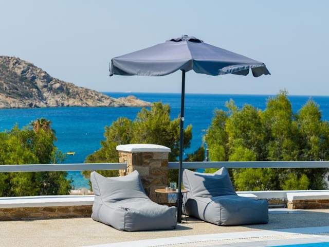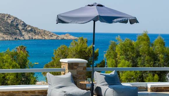 Das Hotel befindet sich nur 100 Meter vom mit der Blauen Flagge ausgezeichneten Strand von Mylopotas auf der Insel Ios entfernt. In der Umgebung finden sich traditionelle Tavernen mit frischem Fisch, Bars und Geschäfte, alles innerhalb von 100 Metern. Der Hafen von Ios ist 5 km entfernt und die Stadt Ios ist in 3 km erreichbar.