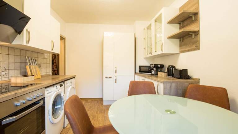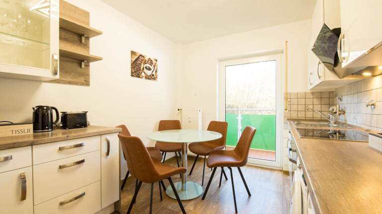 Die Ferienwohnung umfasst 3 Schlafzimmer, 1 Badezimmer, Bettwäsche, Handtücher, einen Flachbild-TV, einen Essbereich, eine voll ausgestattete Küche sowie einen Balkon mit Gartenblick.