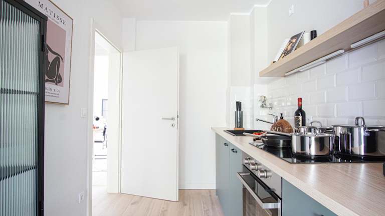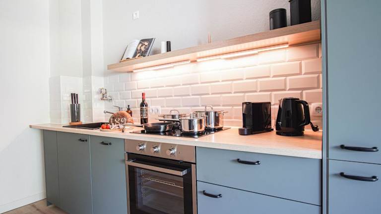 Die Ferienwohnung besteht aus einem Schlafzimmer, einem Wohnzimmer und einer komplett ausgestatteten Küche mit Kühlschrank und Kaffeemaschine. Das Badezimmer ist mit einer Dusche und einem Haartrockner ausgestattet. Handtücher und Bettwäsche werden bereitgestellt.
