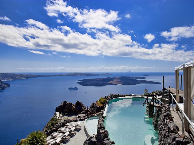 Imerovigli gelegen, auf einem Felsvorsprung schwarzen Lavagesteins direkt am Kraterrand mit atemberaubendem Panoramablick auf die Ägäis. Der Ort bietet zahlreiche Tavernen und Geschäfte, welche ca. 200 m entfernt sind. Thira kann entweder nach ca. 25 Gehminuten auf einem romantischen Weg oder per Linienbus, Haltestelle in ca. 200 m Entfernung, erreicht werden. Der Flughafen ist etwa 10 km entfernt und der nächste Strand ca. 20 km.