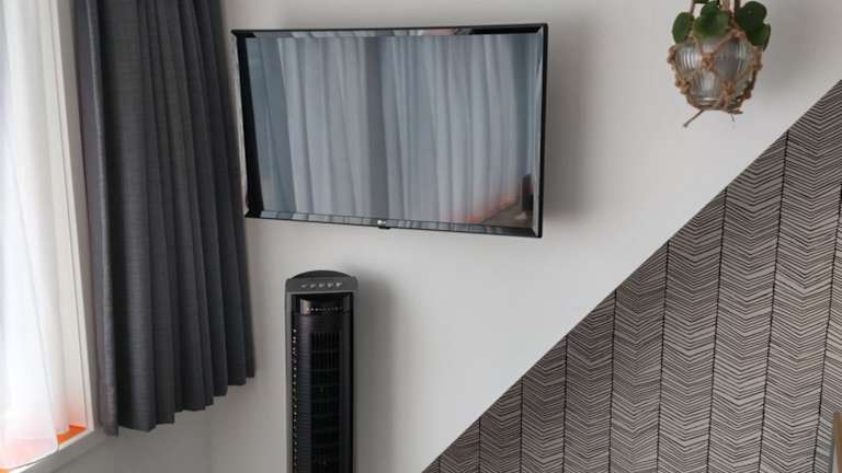 Jedes Zimmer in der Unterkunft Hoogland aan Zee ist mit einem Kleiderschrank, einem Flachbild-TV und einem eigenen Badezimmer ausgestattet. Die Gäste finden Bettwäsche und Handtücher vor. Zudem verfügen alle Zimmer über eine Terrasse mit Stadtblick und einen Kühlschrank.