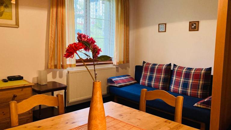 Die Ferienwohnung verfügt über ein Wohnzimmer mit einem Flachbild-TV, eine voll ausgestattete Küchenzeile mit Kühlschrank und Geschirrspüler, sowie ein Badezimmer mit Dusche. Handtücher und Bettwäsche werden bereitgestellt.