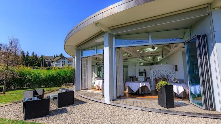 Das Restaurant bietet eine ausgezeichnete Küche mit Blick auf den See und die Berge. Es hat 15 Punkte im Restaurantführer Gault-Millau erhalten. Die Karte umfasst sowohl Schweizer als auch internationale Gerichte, darunter frischen Fisch aus dem Greyerzersee. Die Veranda lädt dazu ein, die Landschaft zu geniessen.