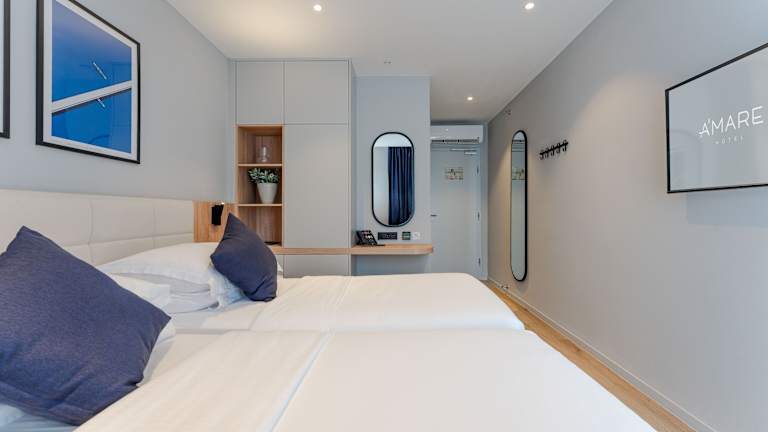 Die Zimmer im Hotel A'mare sind mit Klimaanlage, Heizung und Teppichboden ausgestattet. Sie bieten ein Queensize-Bett oder ein Sofabett sowie einen Schreibtisch und einen Safe. Zu den technischen Annehmlichkeiten gehören ein TV-Gerät mit Satellitenempfang, ein Radio, ein Wecker und kostenloses Wifi. Im Badezimmer stehen eine Dusche, ein Haartrockner sowie Kosmetikartikel zur Verfügung. Familien- und Nichtraucherzimmer sind ebenfalls verfügbar.
